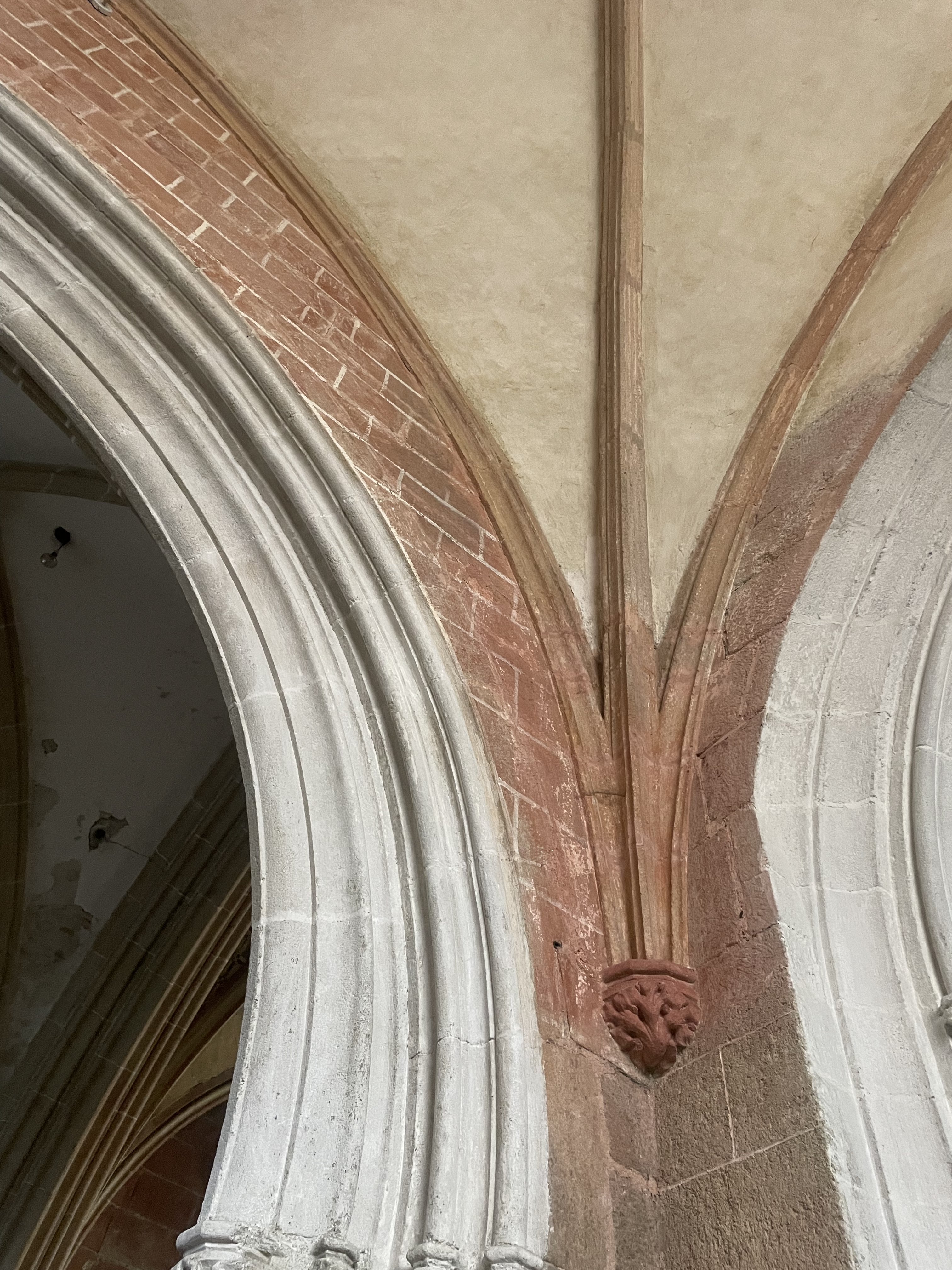 Profil des nervures peintes en rouge d'une voûte de l'église de Notre-Dame de Kernascléden