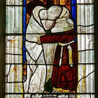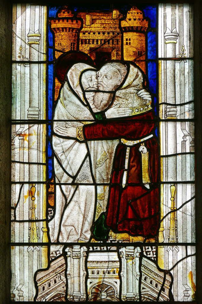 Rencontre de Joachim et Anne devant la porte dorée, maîtresse vitre de l'église Notre-Dame-de-la-cour de Lantic, (1460-1470)
