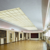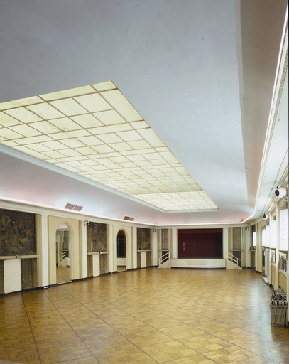 - vue de la grande salle, prise dos au grand escalier l'on peut y voir la verrière ainsi que la scène