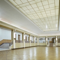- vue de la grande salle prise dos à la scène et montrant, la verrière, le grand escalier et la mezzanine