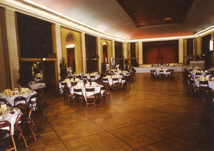- vue de la grande salle, vers la scène tables dressées pour un banquet