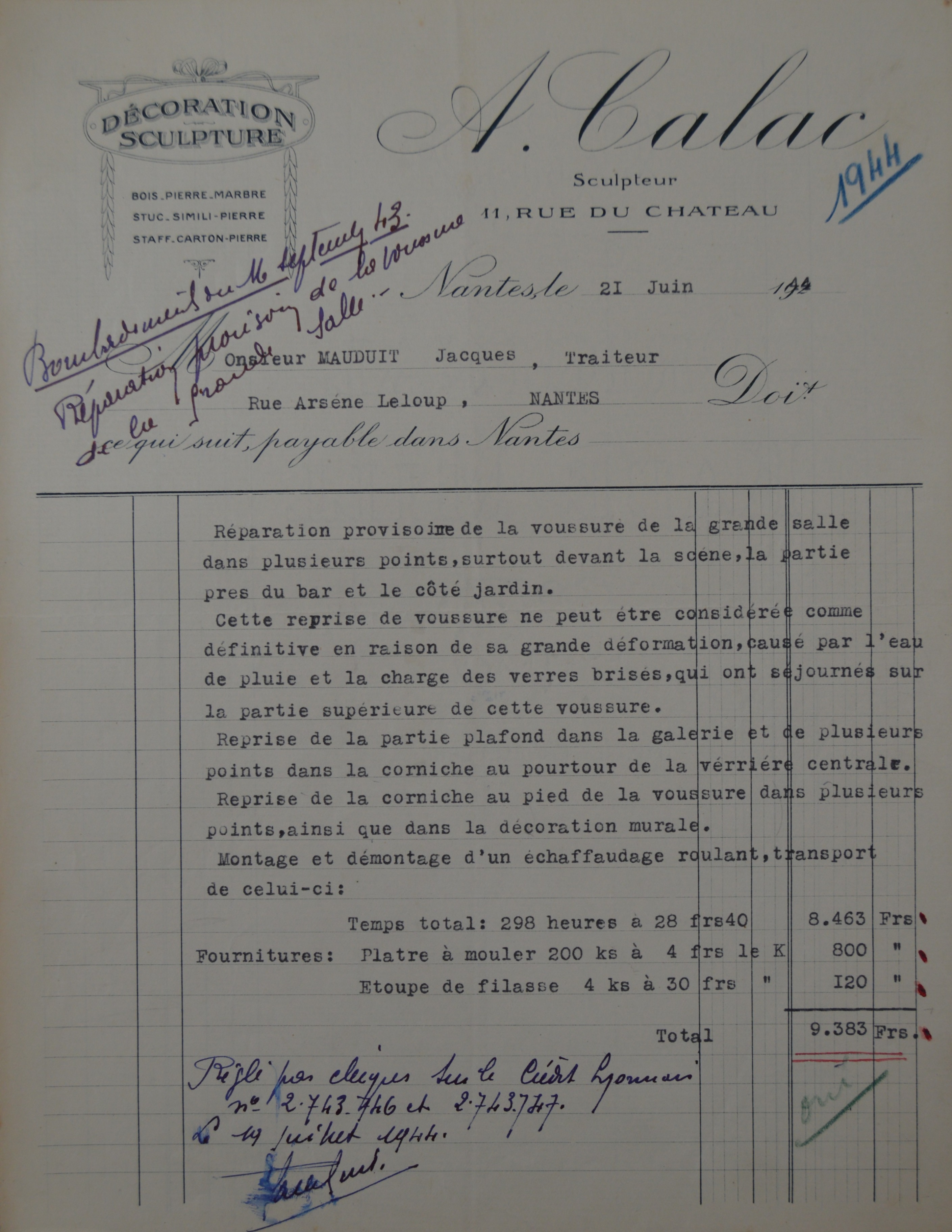 - facture pour le remplacement de la voussure