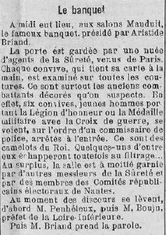 - article évoquant la venue d'aristide briand à nantes et du banquet organisé aux salons mauduit pour l'occasion