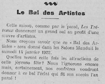 - annonce d'un grand bal au profit d'une œuvre d'artistes ce bal est organisé par « les tréteaux »